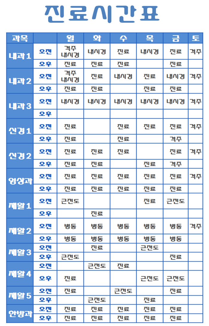 MRI, CT, C-ARM등 첨단의료장비를 구비하고, 내과(3명),신경과(2명),영상의학과(1명),가정의학과(1명),한방과(1명)등 전문화된 의료진으로 전문진료체제를 구축하고 있습니다.
