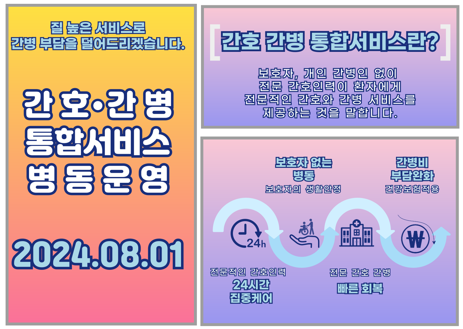 [19 августа 2024 г.] Медицинский центр Новос в Сеуле начинает предоставление интегрированных услуг сестринского ухода и заботы с августа 2024 года. Интегрированные услуги сестринского ухода и заботы — это ориентированная на пациента медицинская система, в рамках которой профессиональный медицинский персонал обеспечивает круглосуточный уход и наблюдение без необходимости присутствия сиделки или сопровождающего лица. Данная система позволяет снизить финансовую нагрузку на пациентов и их семьи, а также обеспечивает безопасную и высококачественную медицинскую помощь.