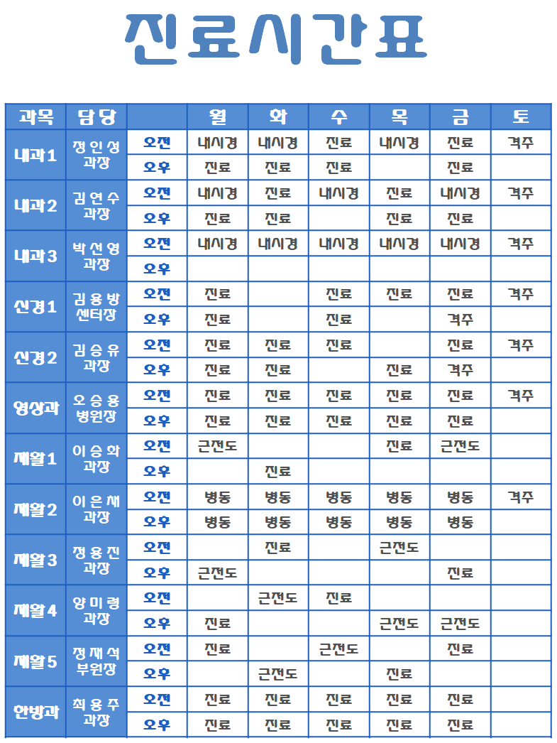 독일 지멘스 3.0T MRI, 캐논 Aquilion CT, C-ARM(ZEN-5000) 영상진단, OsteoSys 골밀도진단기등 첨단의료장비를 구비하고, 내과(3명),신경과(2명),영상의학과(1명),가정의학과(1명),한방과(1명)등 전문화된 의료진으로 전문진료체제를 구축하고 있습니다.