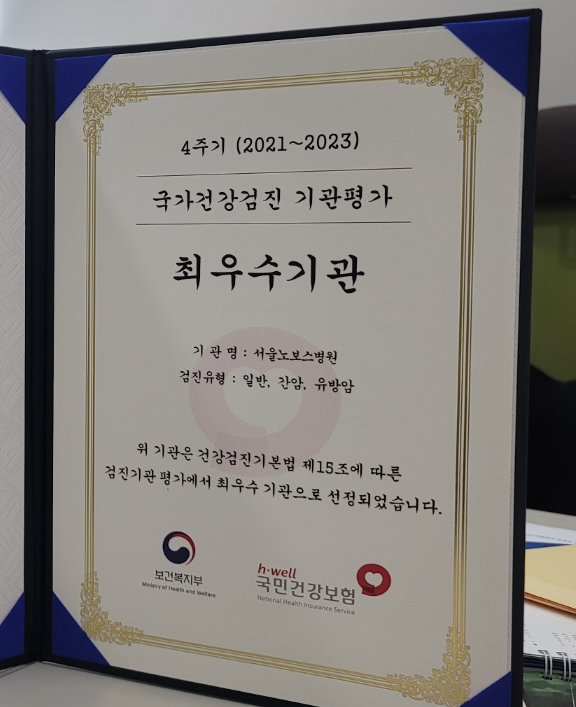 [13 июня 2024 г.] Больница Seoul Novos Hospital получила наивысшую оценку, войдя в топ-10% медицинских учреждений, по шести направлениям оценки: общий медицинский скрининг, скрининг рака желудка, колоректального рака, рака печени, рака молочной железы и рака шейки матки — в рамках 4-го этапа оценки скрининговых учреждений уровня больниц и клиник, недавно опубликованного Министерством здравоохранения и социального обеспечения. Кроме того, больница подтвердила высокий уровень качества национального медицинского скрининга, получив наивысшую оценку по трём направлениям: общий скрининг, скрининг рака печени и скрининг рака молочной железы.